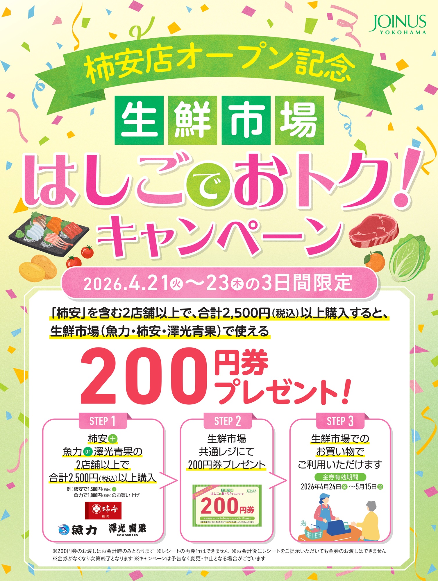柿安店のオープンを記念し、生鮮市場では4/21(火)~23(木)の3日間限定のキャンペーンを実施します!