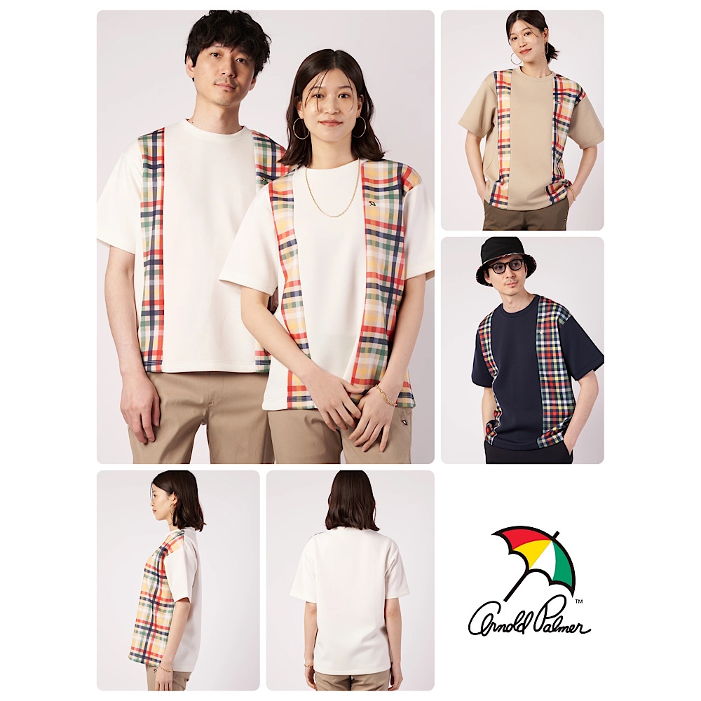 パーマーチェックのプリント生地を切り替えで取り入れた、ブロッキングデザインが目を引くTシャツのご紹介です。