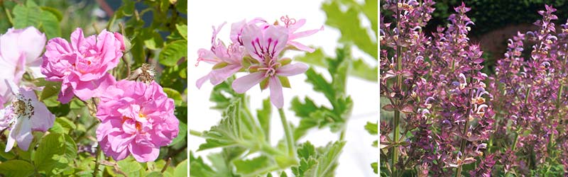 ローズ、ゼラニウム、クラリセージが女性に寄り添い