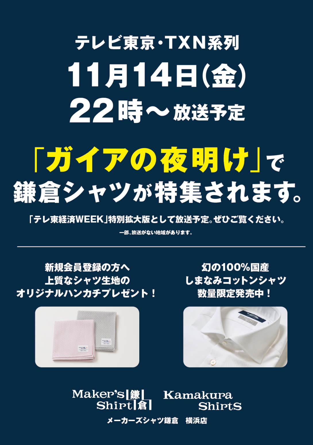 この度、テレビ東京系列「日経スペシャル ガイアの夜明け」にて、メーカーズシャツ鎌倉(鎌倉シャツ)が特集されることになりました。