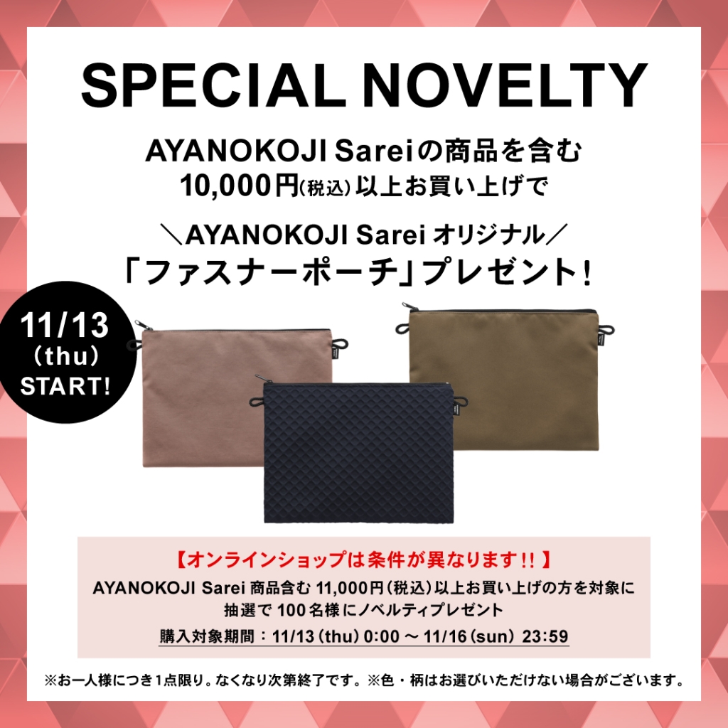 11月13日(木)~11月16日(日)の期間中、AYANOKOJI Sarei 商品のご購入に対してアプリポイントを8%還元!