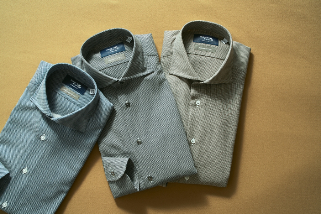 高級スーツにも用いられるSUPER120'sクラスの高番手ウールを贅沢に採用し、ドレスシャツとして仕立てた特別な1枚。