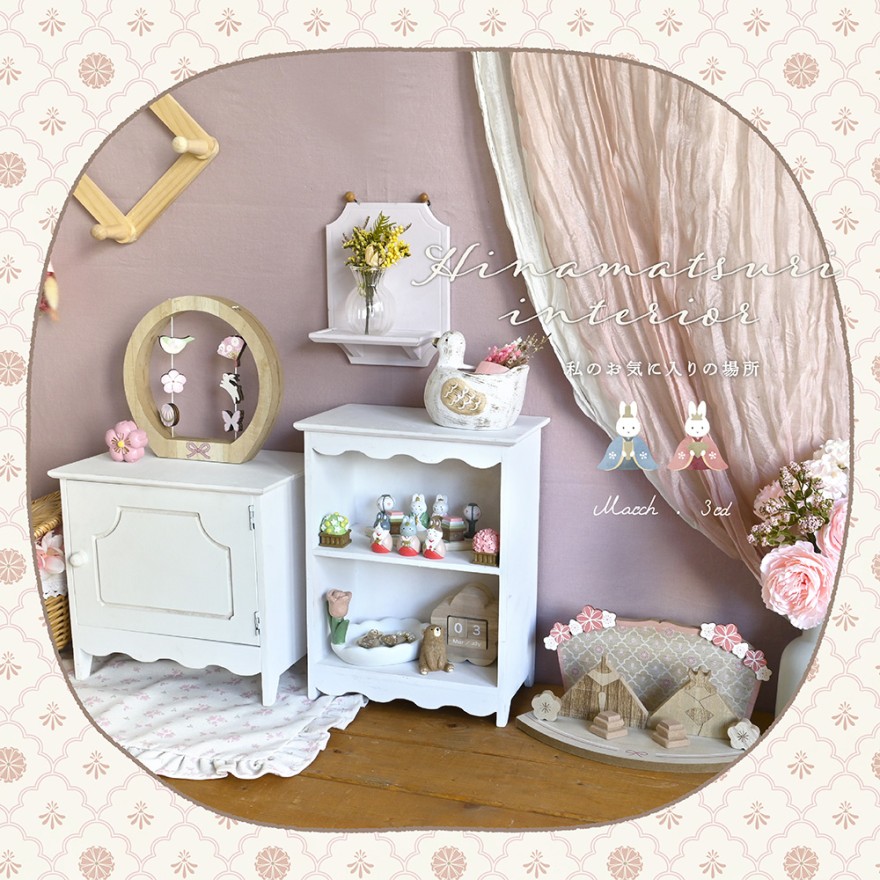 木製の雛台やフリルデザインのシェルフなどに組み合わせて