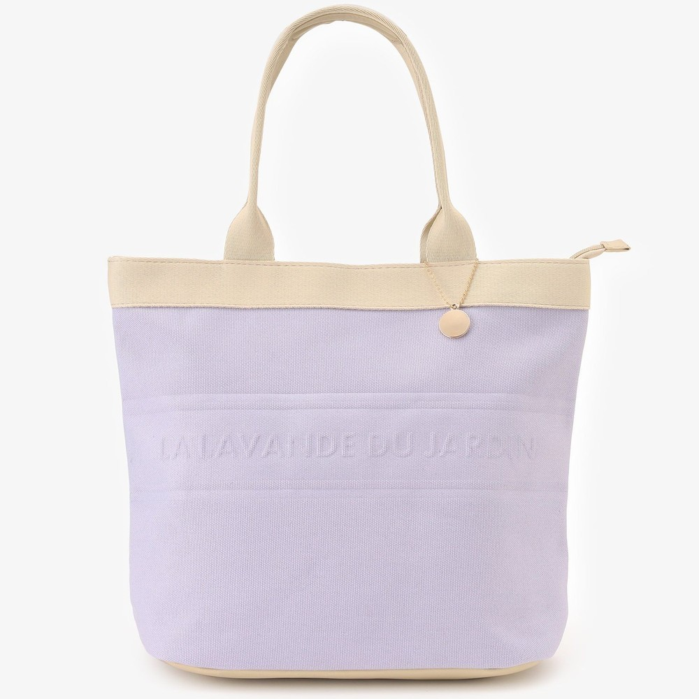 バッグ地に合わせて「庭のラベンダー」という意味のタイポグラフィをエンボス加工であしらい、立体感をプラスしました。