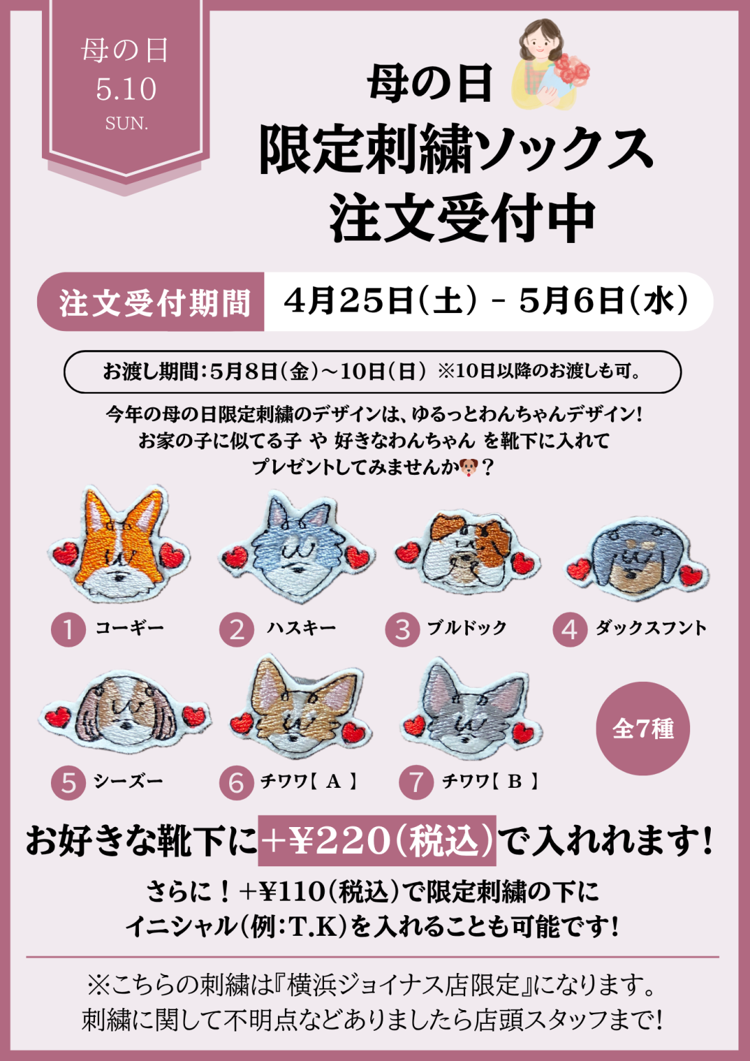 ※刺繡オーダーの際には時間をいただいております、お時間に余裕を持ってお越しくださいませ。