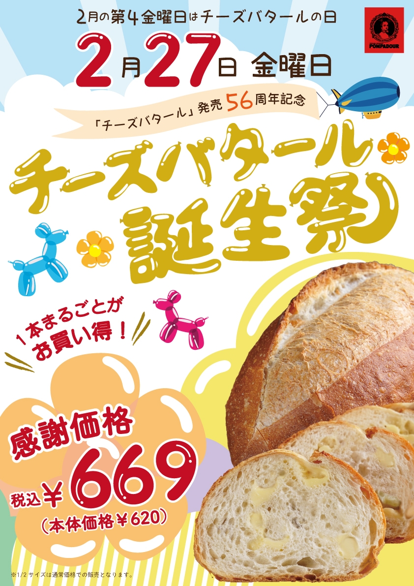 ポンパドウルの看板商品「チーズバタール」を長年ご愛好頂いているお客様への感謝と、新たにチーズバタールの美味しさを知っていただくため特別価格にて販売します。