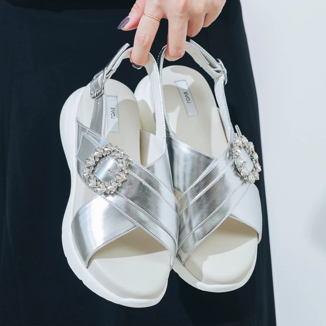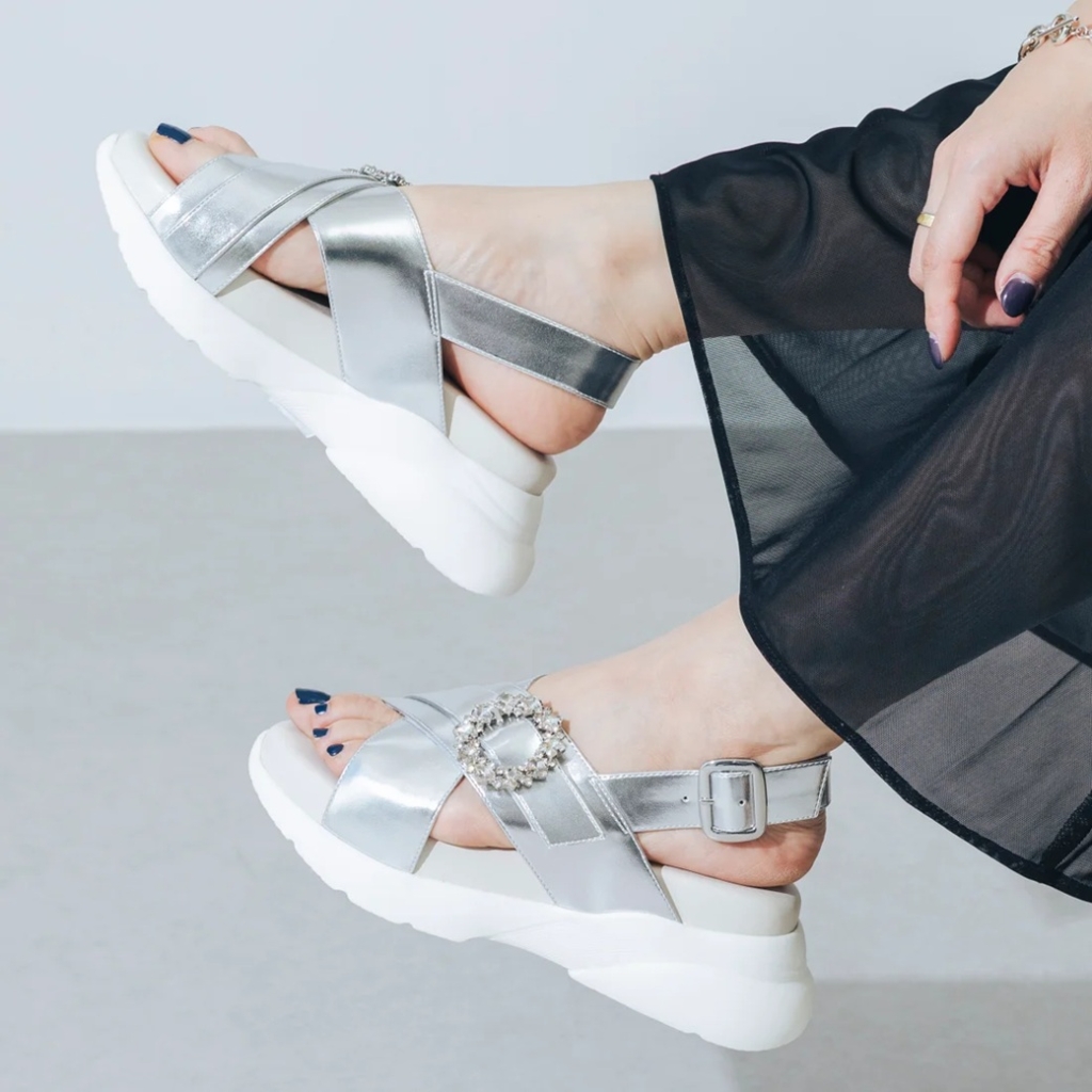 キラキラビジューがポイントのクロスベルトと、3段階調節可能なバックベルトが足をしっかりホールド◎