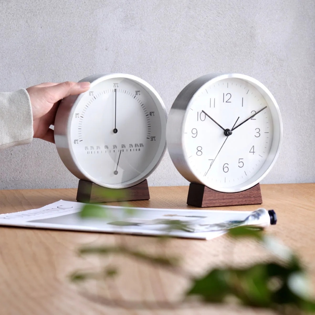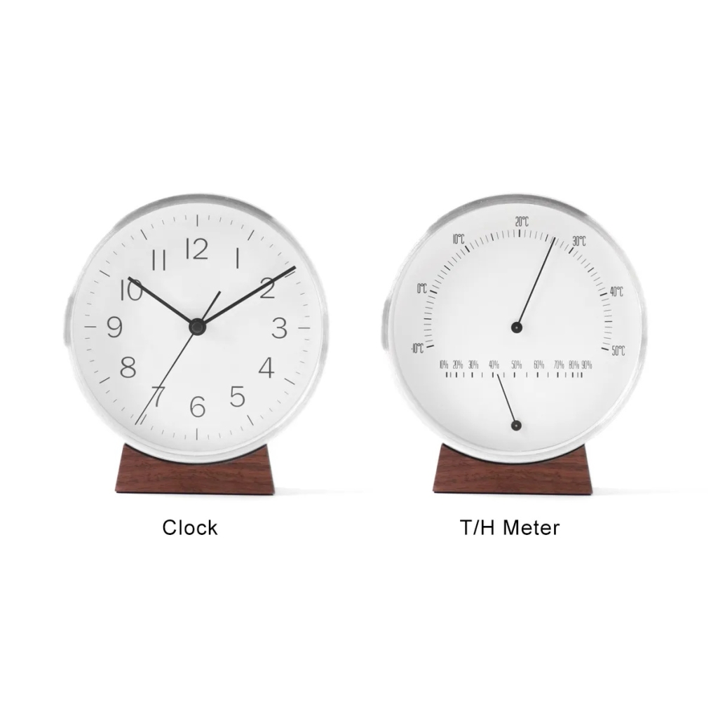 アルミの軽やかさと、天然木のぬくもりが心地よく調和した時計 / 温湿度計。