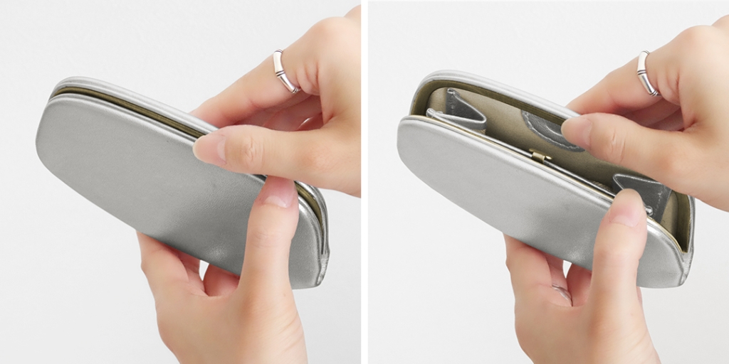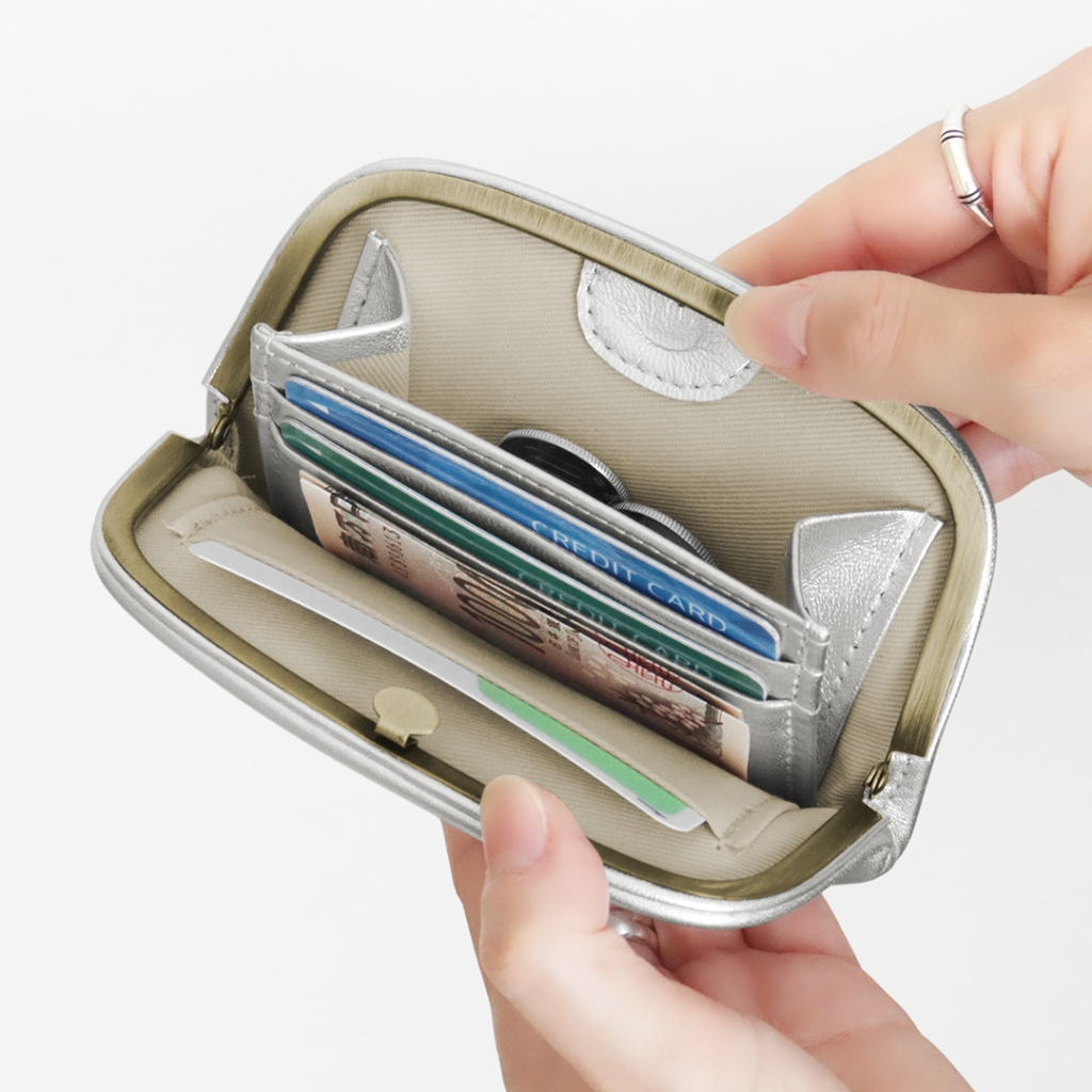 がま口を開けるときは、上部中心を背面から押すだけで簡単に開けられます。