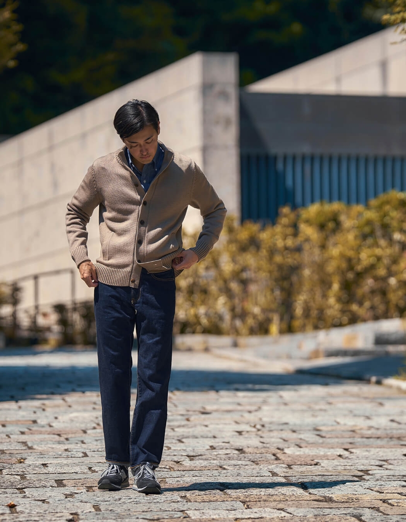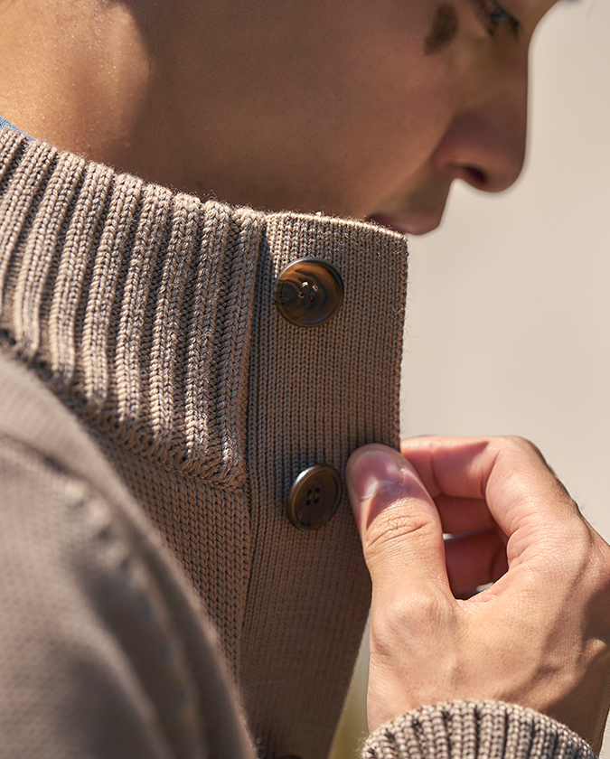 糸色に調和するスコッチボタンなど細部の仕立てにこだわったディテール。