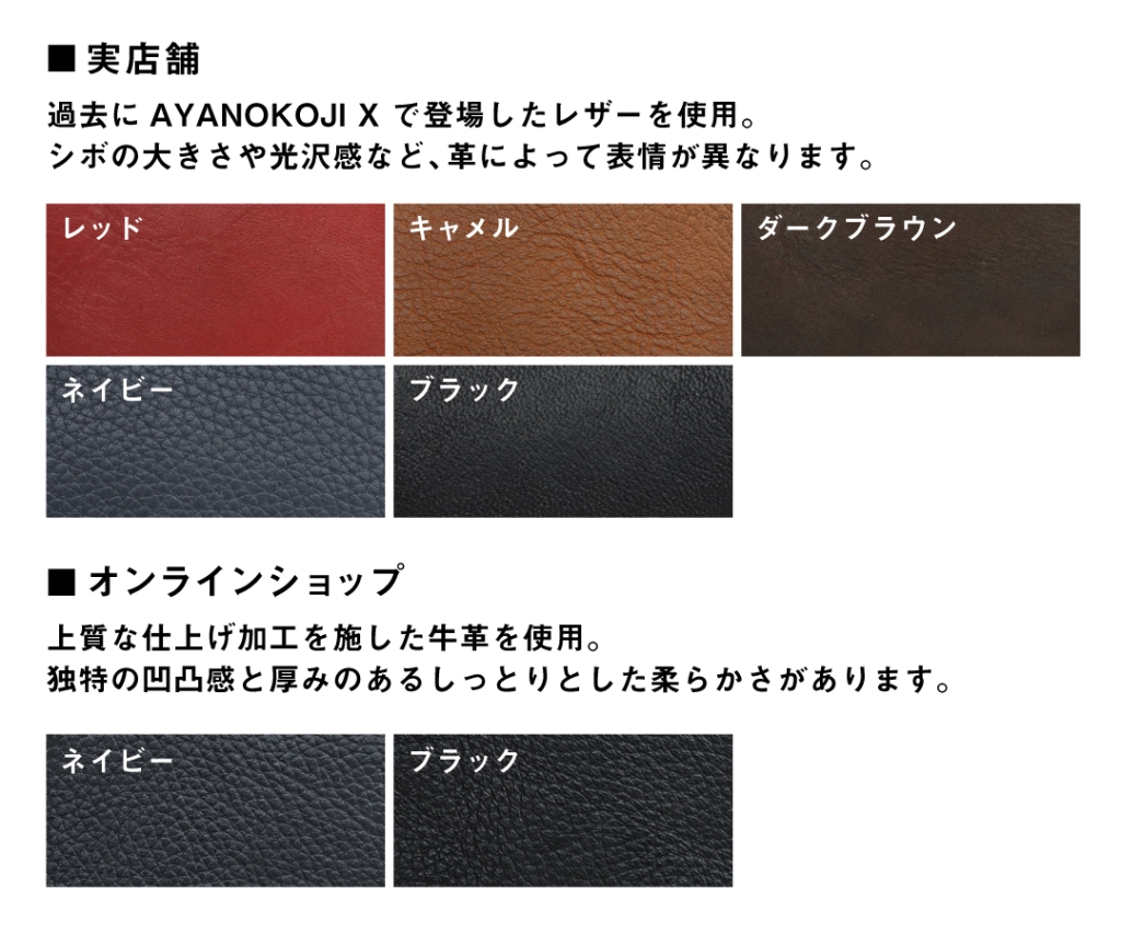 実店舗では、過去にAYANOKOJI Xで登場したレザーをランダムに使用したアソートとなっており