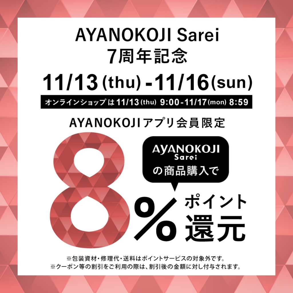 11月13日(木)~11月16日(日)の期間中、AYANOKOJI Sarei 商品のご購入に対してアプリポイントを8%還元!