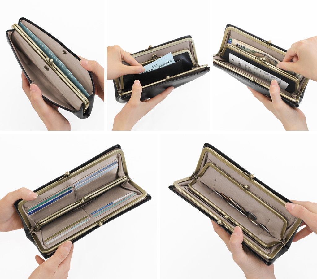 お札やレシートも入れられます。小銭が入れられる子がま口は大きく開いて中が見えやすくなっています。