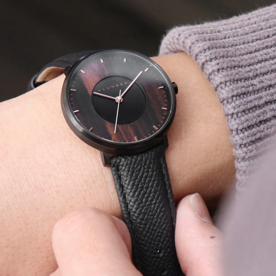 文字盤にある太陽電池が光を電気に変える、木製ソーラー腕時計。
