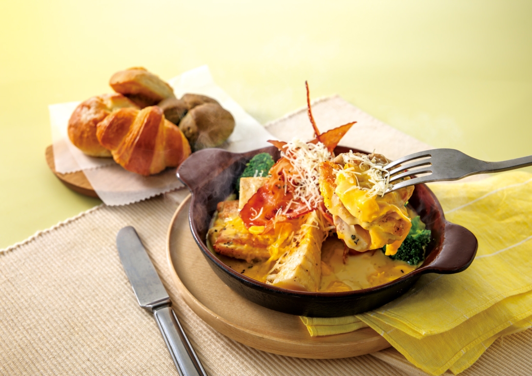 香ばしく焼き上げたグリルチキンに、ふわとろ卵を合わせた濃厚カルボナーラソースをたっぷり。