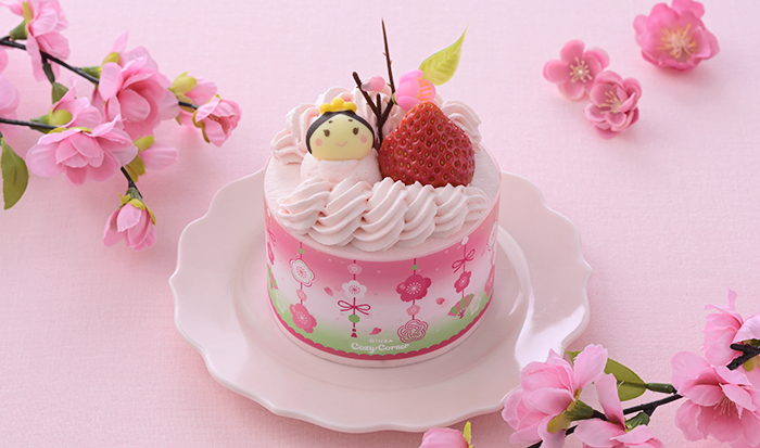 おひなさまと、苺&苺クリームを飾ったプチデコレーションケーキ。ほんのり甘ずっぱい苺クリームをふわふわスポンジでサンドしました。