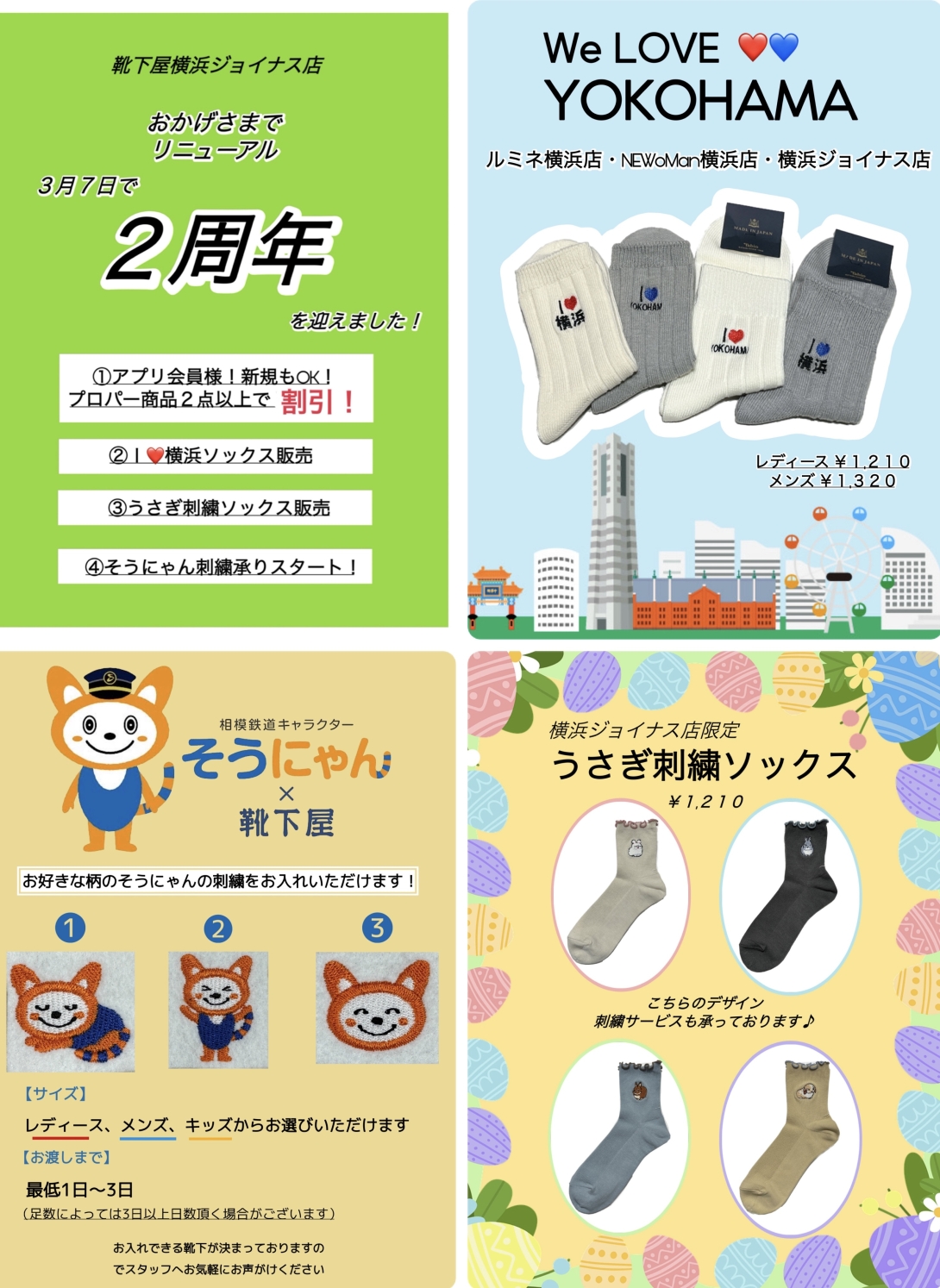 この度、3月7日(土)に靴下屋横浜ジョイナス店リニューアル2周年を迎える事になりました㊗️